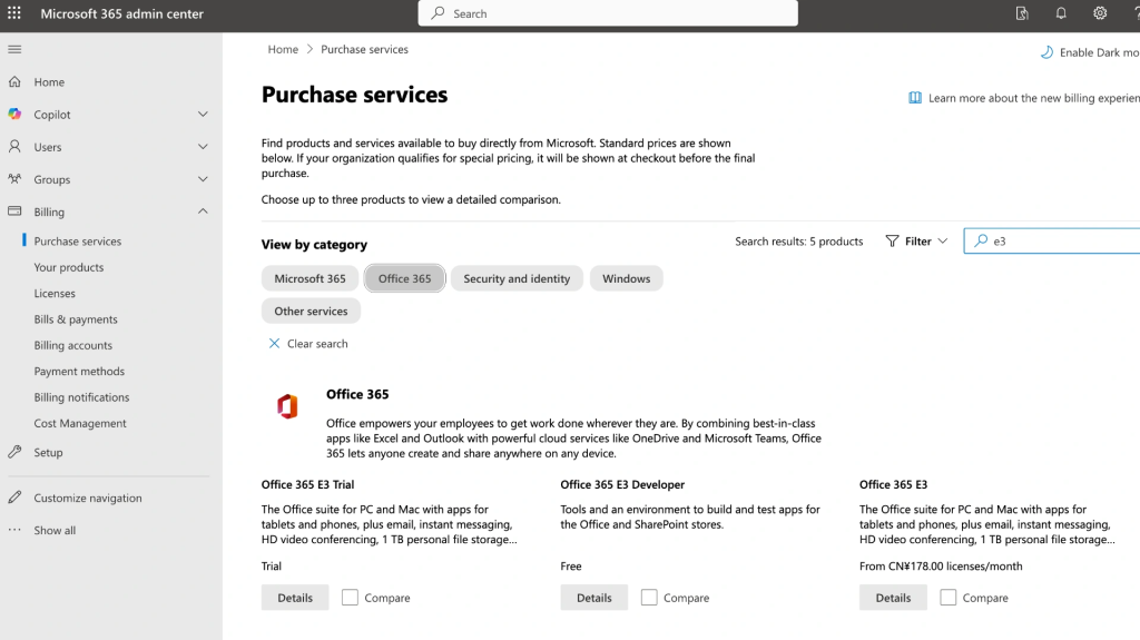 左侧 账单→购买服务 过滤 e3 找到 Office 365 E3 Dev.... 点Details